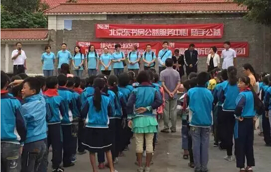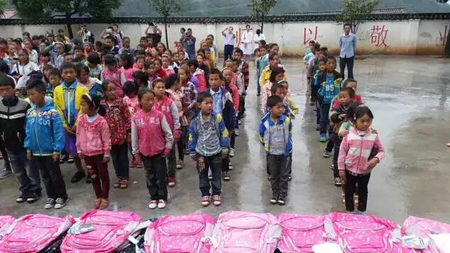 當地小學校環境艱苦,桌椅陳舊,牽動著每個人的心,志愿者為當地小朋友分發用品